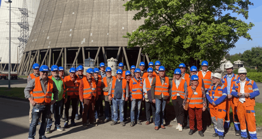Bildunterschrift: Niedersächsische Grüne mit den Vertretern der RWE vor einem der Kühltürme auf dem Betriebsgelände in der Nähe von Hanekenfähr